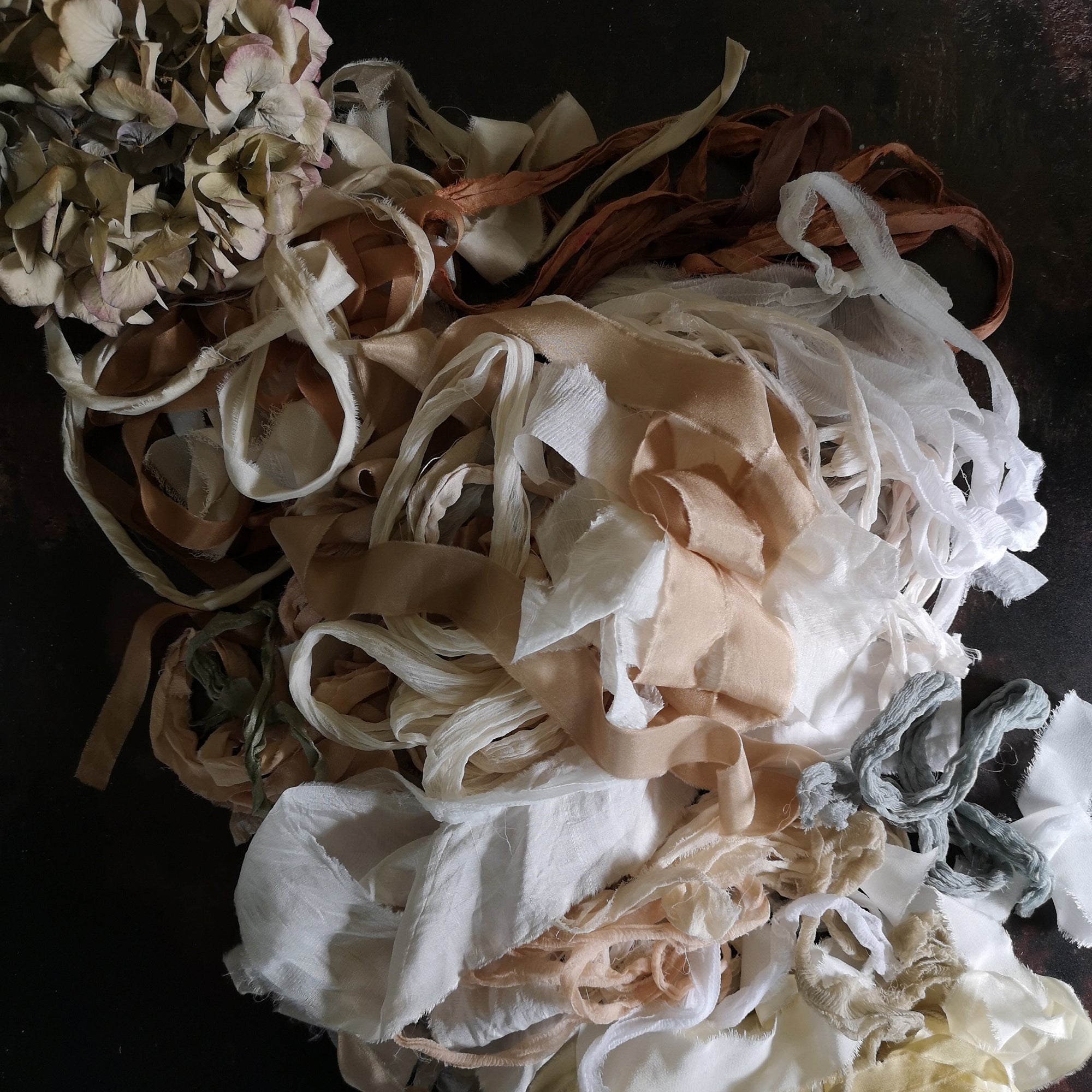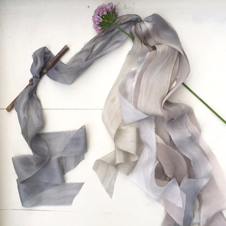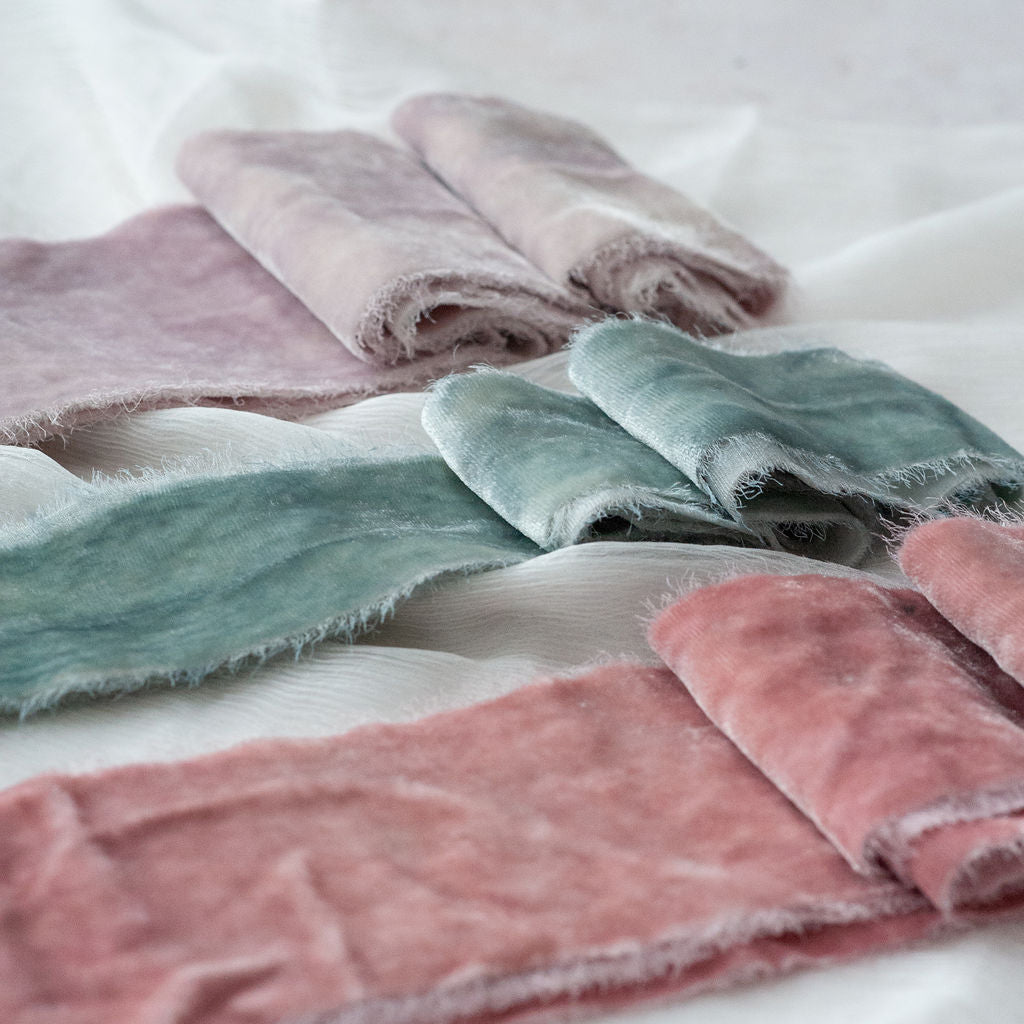 Soft and drapey Silk Velvet Ribbons, lovingly handmade in Seasonal shades using aged dying methods.
