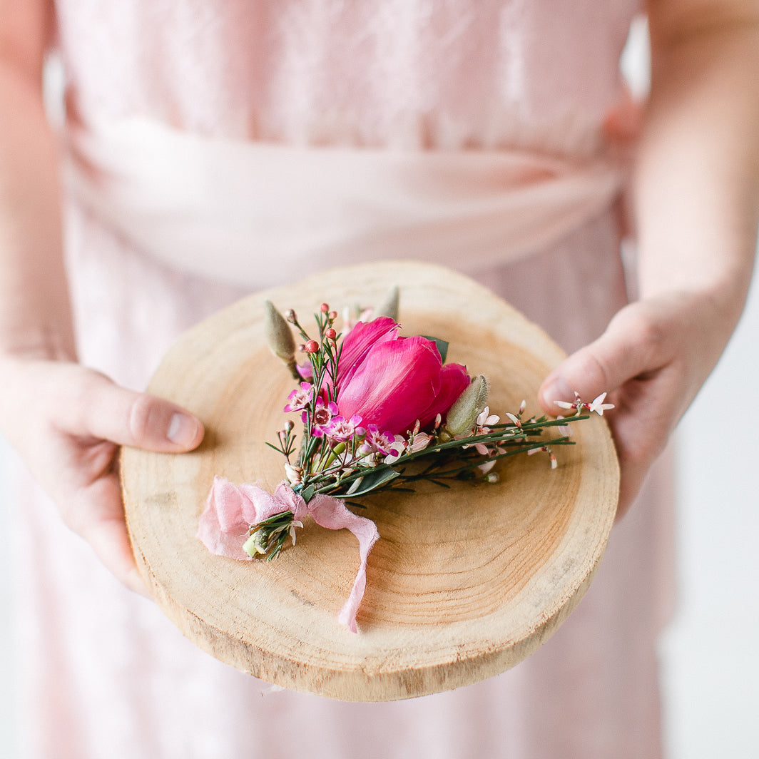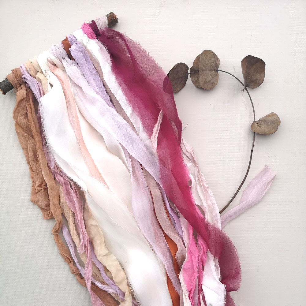 A branch foraged from the woods, decorated in Botanical Dyed Silk Ribbon in rustic and luxe textures.